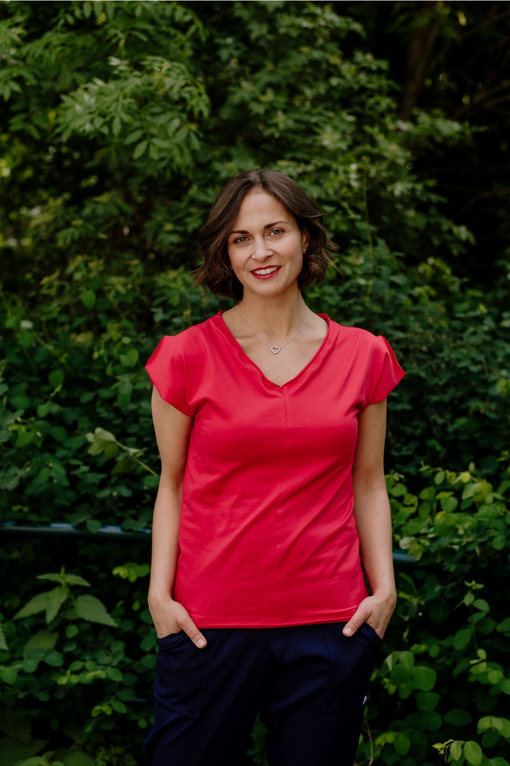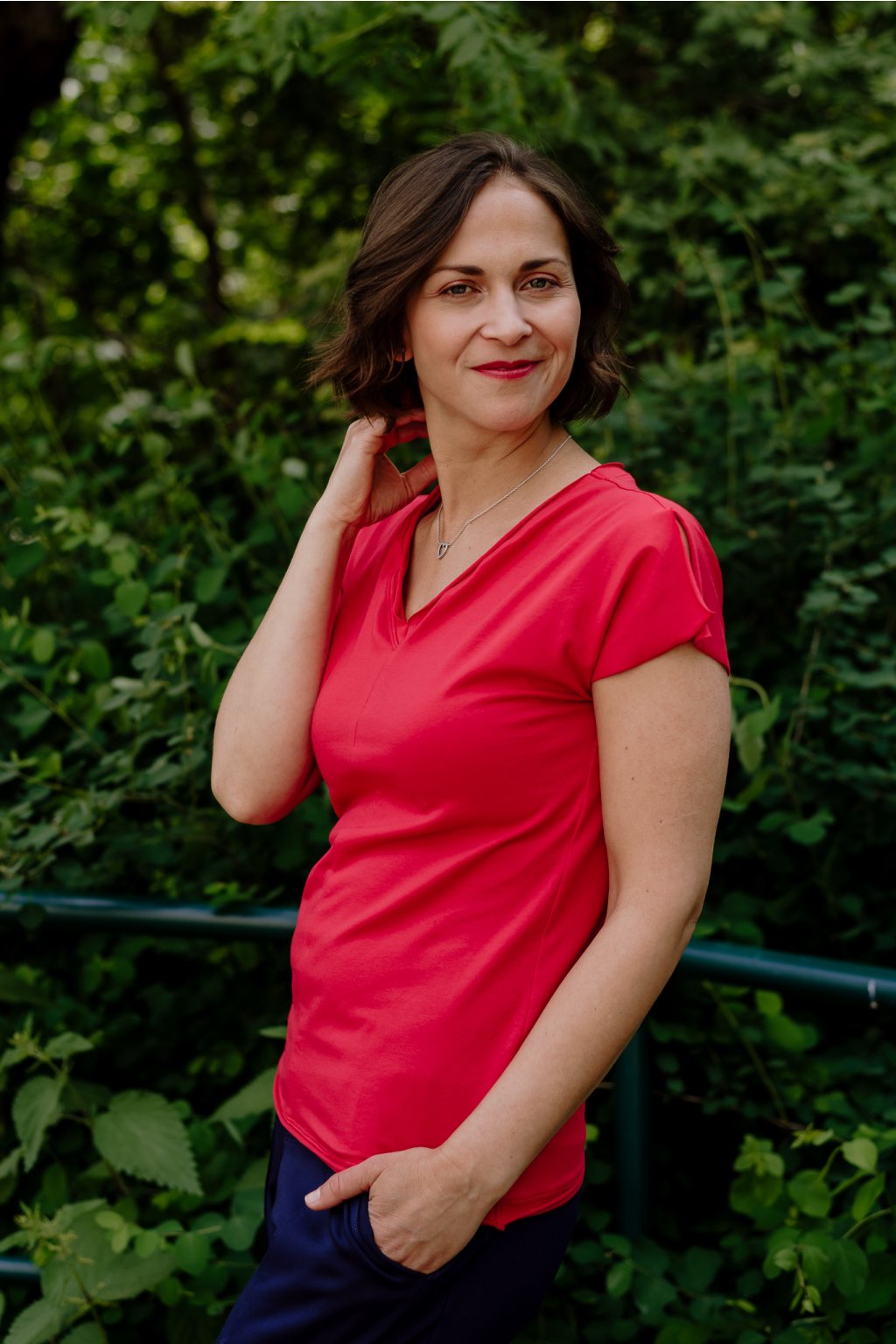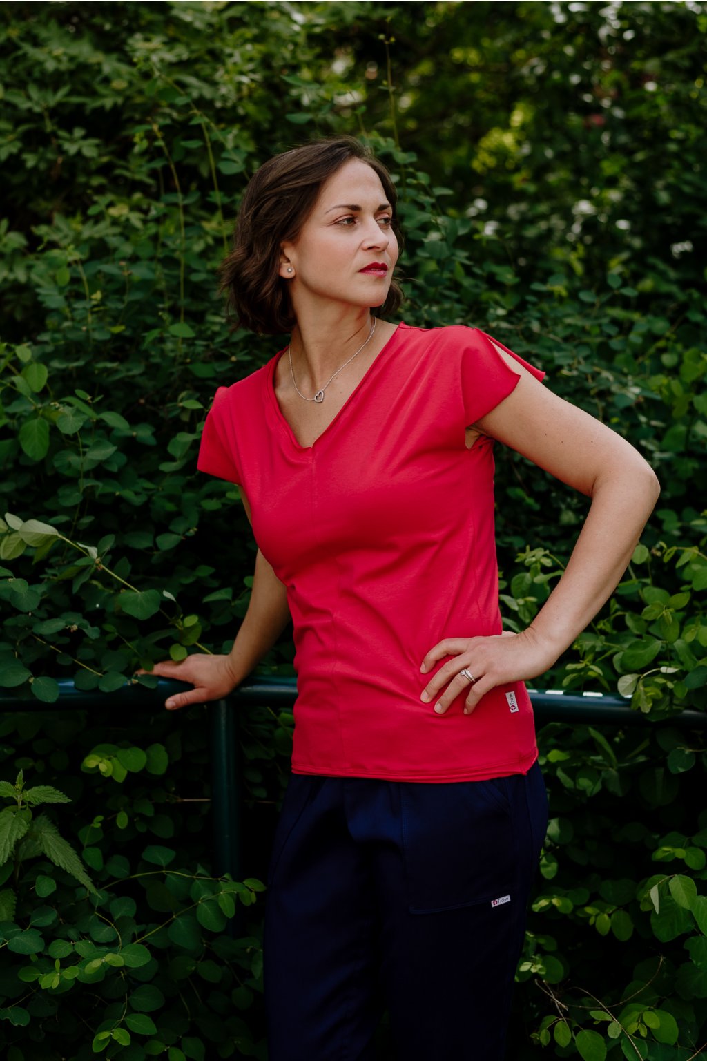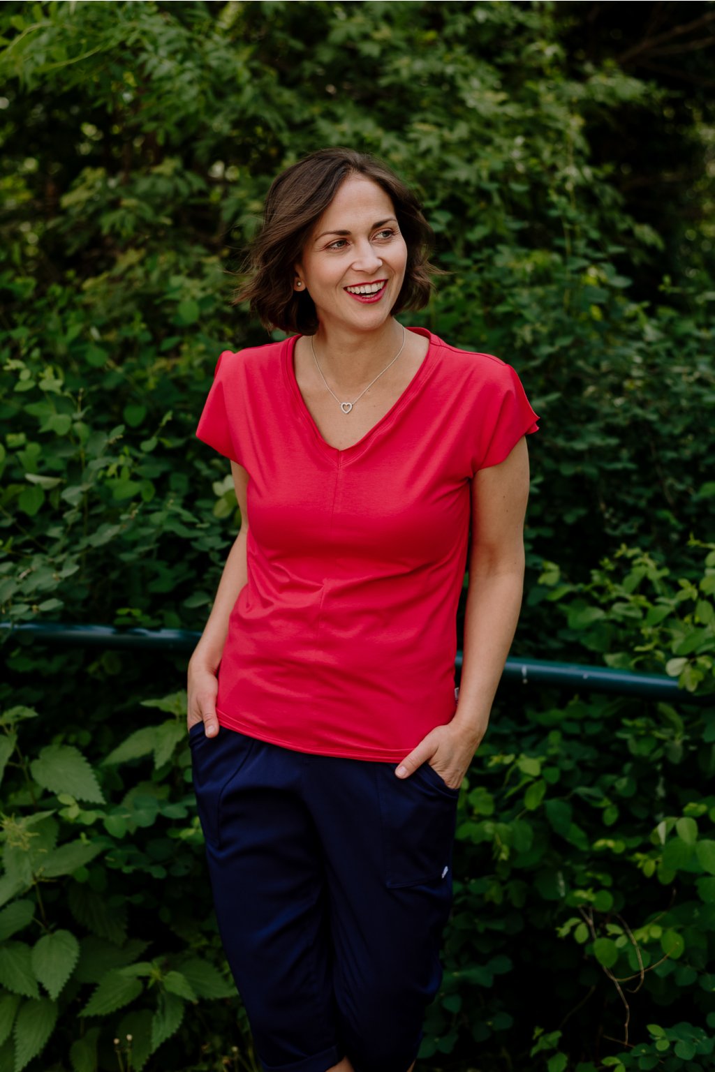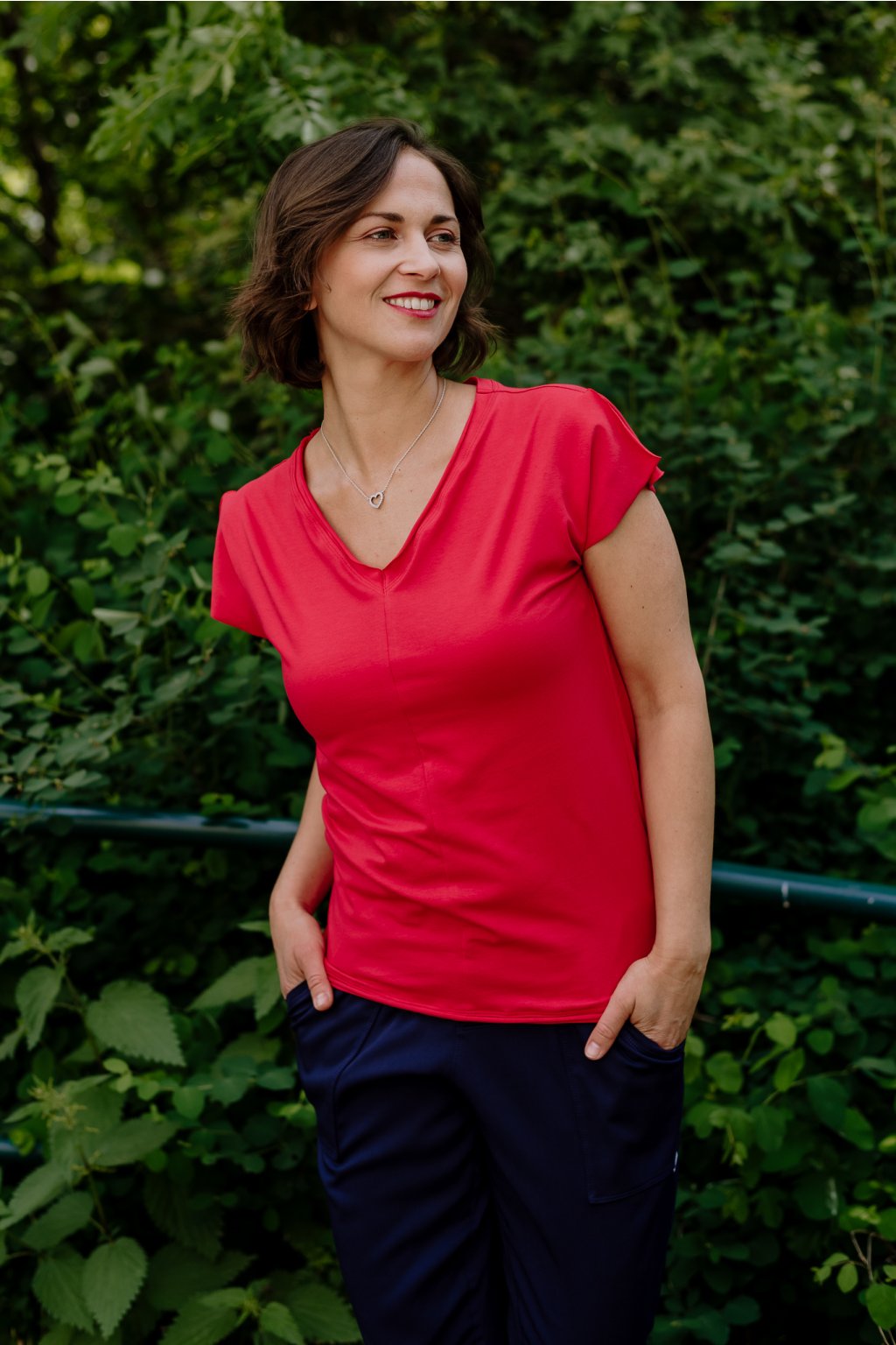 Tričko, které splňuje vše co od pohodlí očekáváte. Je velice slušivé pro každou postavu. Krásně umí schovat bříško, má lehce přestřižené krátké rukávky. Střih přes trup je volný v oblasti pasu a středem předního dílu vede šev, díky kterému opticky rozdělíte a tím pádem i zeštíhlíte postavu.