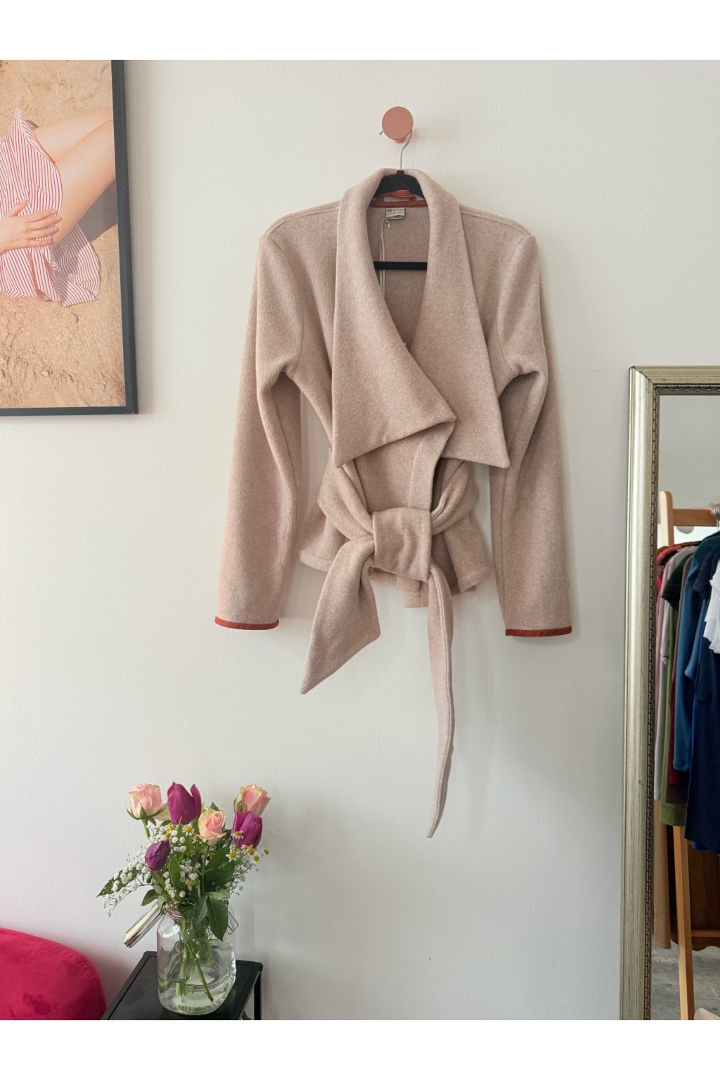 Dokonalý kabátek z měkkého bavlněného fleecu v GOTS kvalitě. Veliké cípy předního dílu tvoří elegantní siluetu postavy. Kabát je doplněný velkým efektním páskem. Cípy kabátku můžete nechat volně viset, nebo je sepnout broží na rameni.